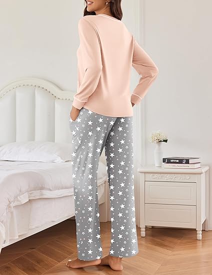 Ekouaer Womens 2 Piece Pajama Set Long Sleeve PJs with Plaid Pants Drawstring Elastic Waist Sleepwear Lounge Set
